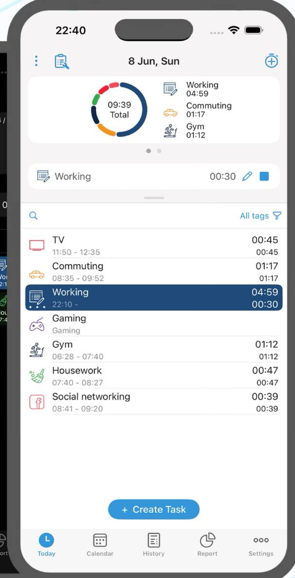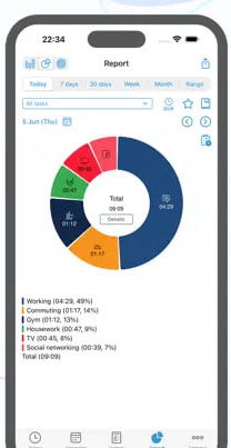 وأهم قسم في التطبيق قسم التقارير، تعرض فيه إحصائيات مقسمة في صورة أشكال بيانية، دوائر وأعمدة وغير ذلك، بخيارات متعددة من التخصيص، عرض مجموع الساعات أو مرات التقييد، اليوم أو الأسبوع أو الشهر أو مجال زمني مخصص. وهذه التقارير يمكن تصديرها في صيغ مختلفة من الملفات.